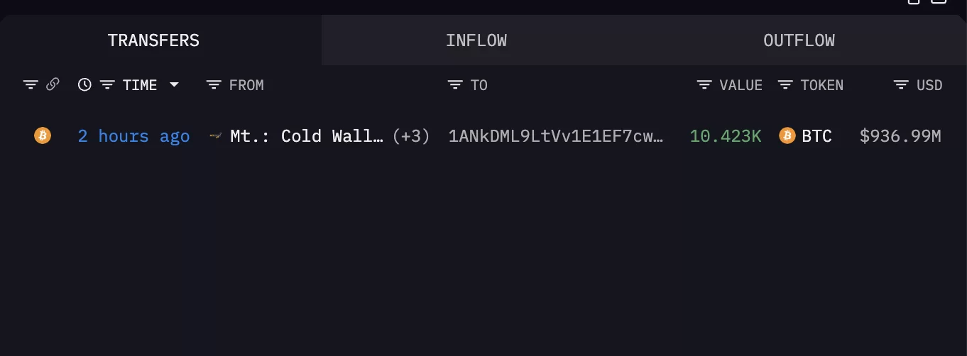 Según datos de Arkham, el consejo de administración de Mt.Gox envió 10.608 Bitcoins por valor de 937 millones de dólares a una nueva dirección que comenzaba con 1ANkDML, por un total de 10.422,6 BTC.