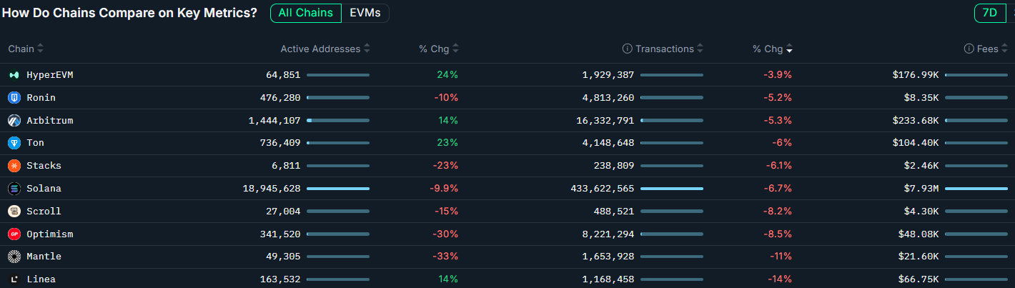 Top blockchains por métricas clave, cambio en las transacciones semanales. Fuente: Nansen