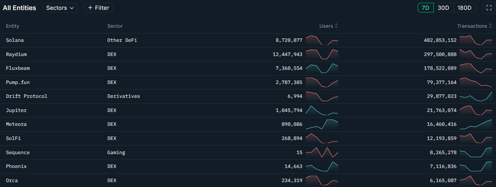 Similar a Avalanche, Dex Trading impulsó la mayoría de la actividad de blockchain, incluido Raydium DEX con 12.4 millones de usuarios y 297 millones de transacciones, seguido de Fluxbeam Dex con 7.3 millones de usuarios y 178 millones de transacciones.