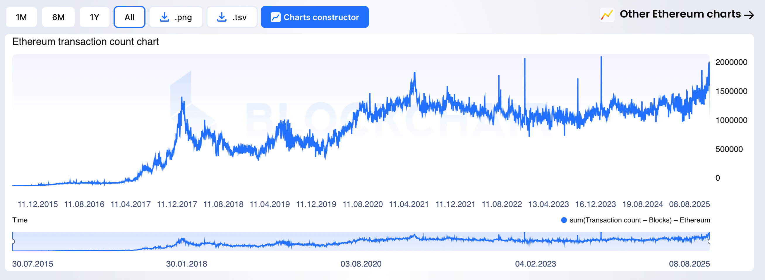 Desde el 29 de julio, la red ha manejado rutinariamente 1.7–1.9 millones de transacciones por día, ocho de los 10 días hasta el 7 de agosto superó 1.7 millones, con máximos de 1,878,031 el 5 de agosto y 1,833,756 el 6 de fin de semana, y una caída de fin de semana a 1,515,955 el 3 de agosto. picos históricos raros.
