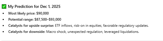 Teniendo en cuenta esta dinámica, ChatGPT predijo que lo más probable es que Bitcoin cotice alrededor de $90,000 el 1 de diciembre de 2025, con un rango probable entre $87,500 y $93,000.