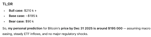 Para su perspectiva para finales de 2025, Finbold recurri贸 al ChatGPT de OpenAI, que predice que Bitcoin podr铆a cotizar cerca de $195,000, respaldado por la mejora de las condiciones macroecon贸micas, las entradas institucionales constantes y la actividad resiliente en la cadena.