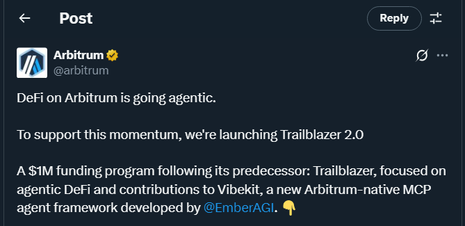 - La Fundación Arbitrum ha lanzado oficialmente Trailblazer 2.0, un programa de subvención de un millón de dólares destinado a apoyar Proyectos de Defi inteligentes construidos con Vibekit.