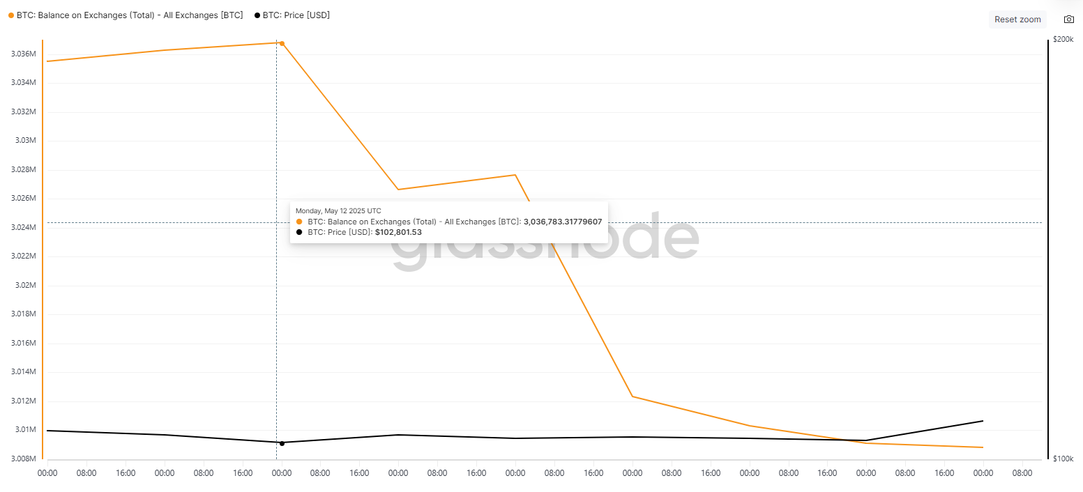 La disminución continua en los equilibrios de cambio indica un patrón de acumulación. Durante la semana pasada, más de 27,976 BTC, con un valor de más de $ 2.88 mil millones, fueron comprados por inversores. Esto ha reducido el suministro disponible a aproximadamente 3 millones de BTC.