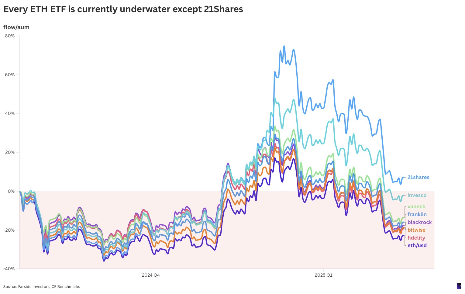 Resulta que 21Shares ‘Ceth, en azul claro, es el único ETF por delante en sus flujos netos.
