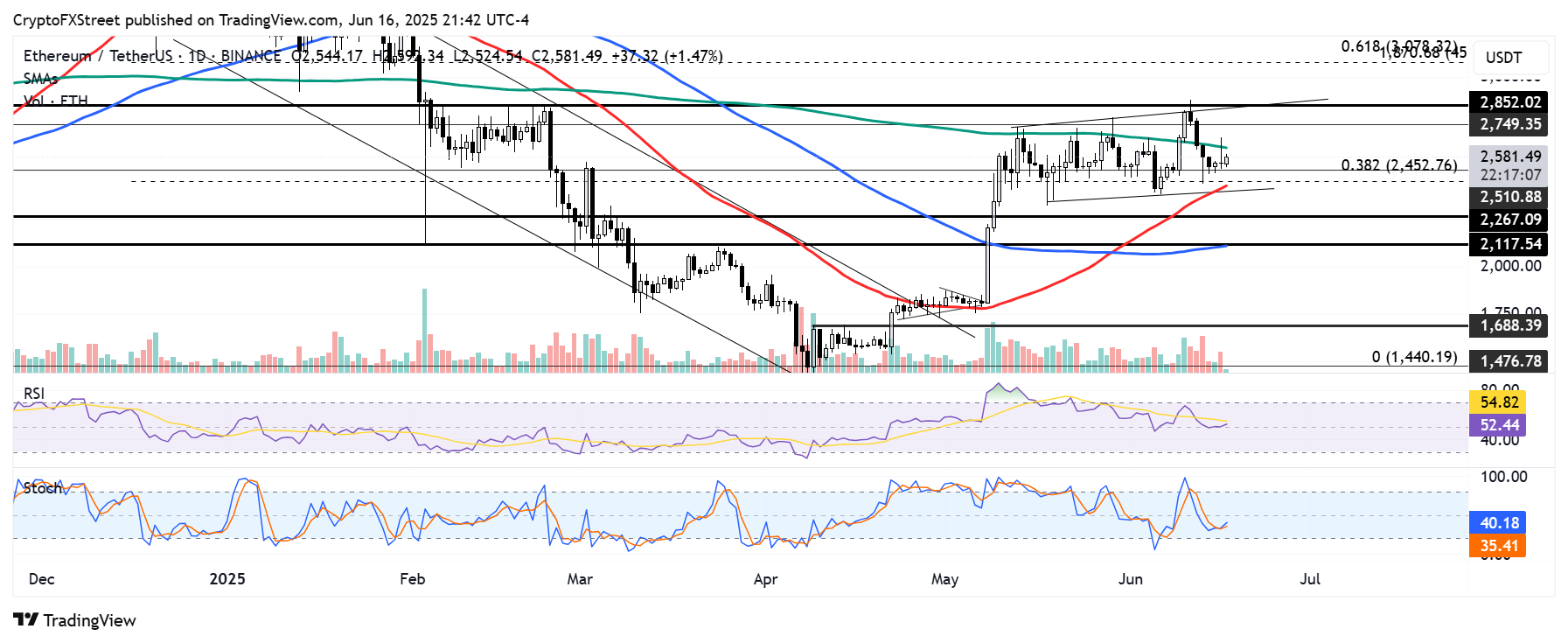 - ETH enfrenta el rechazo en la SMA de 200 días después de mantener el apoyo de $ 2,500 durante el fin de semana.