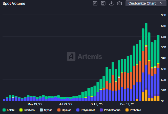 Lanzado en octubre de 2025, Opinion es el tercer mercado de predicción más grande por volumen después de Kalshi y Polymarket, según datos de Artemis. Sin embargo, vale la pena señalar que la validez de sus datos ha sido objeto de escrutinio después de que informara un enorme volumen de 8.000 millones de dólares en enero.