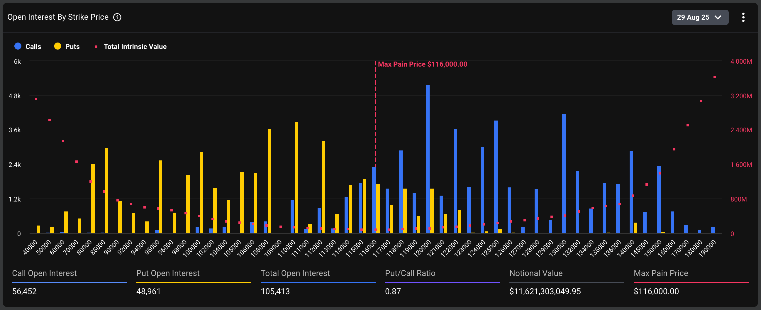 “El vencimiento de BTC señala la persistente demanda de protección a la baja, mientras que ETH se ve más neutral. Combinado con la señal de agujero Jackson de Powell, esta expiración puede ayudar a establecer el tono de mercado para septiembre”, dijo Deribit en X.