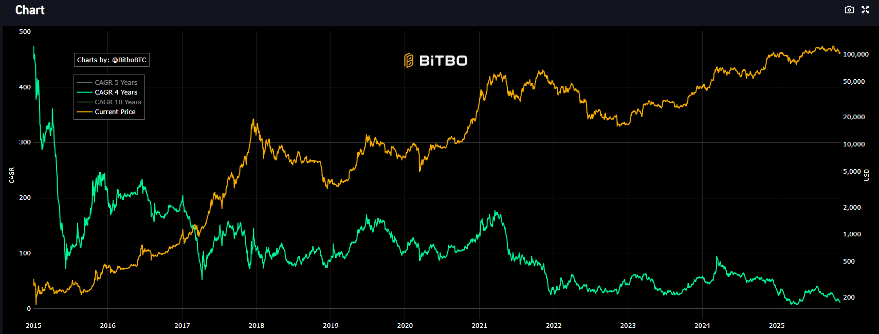 La CAGR de cuatro años de Bitcoin ha ido disminuyendo constantemente este año y cayó a un solo dígito por primera vez en abril. Al 10 de noviembre, rondaba el 13%, según Bitbo.