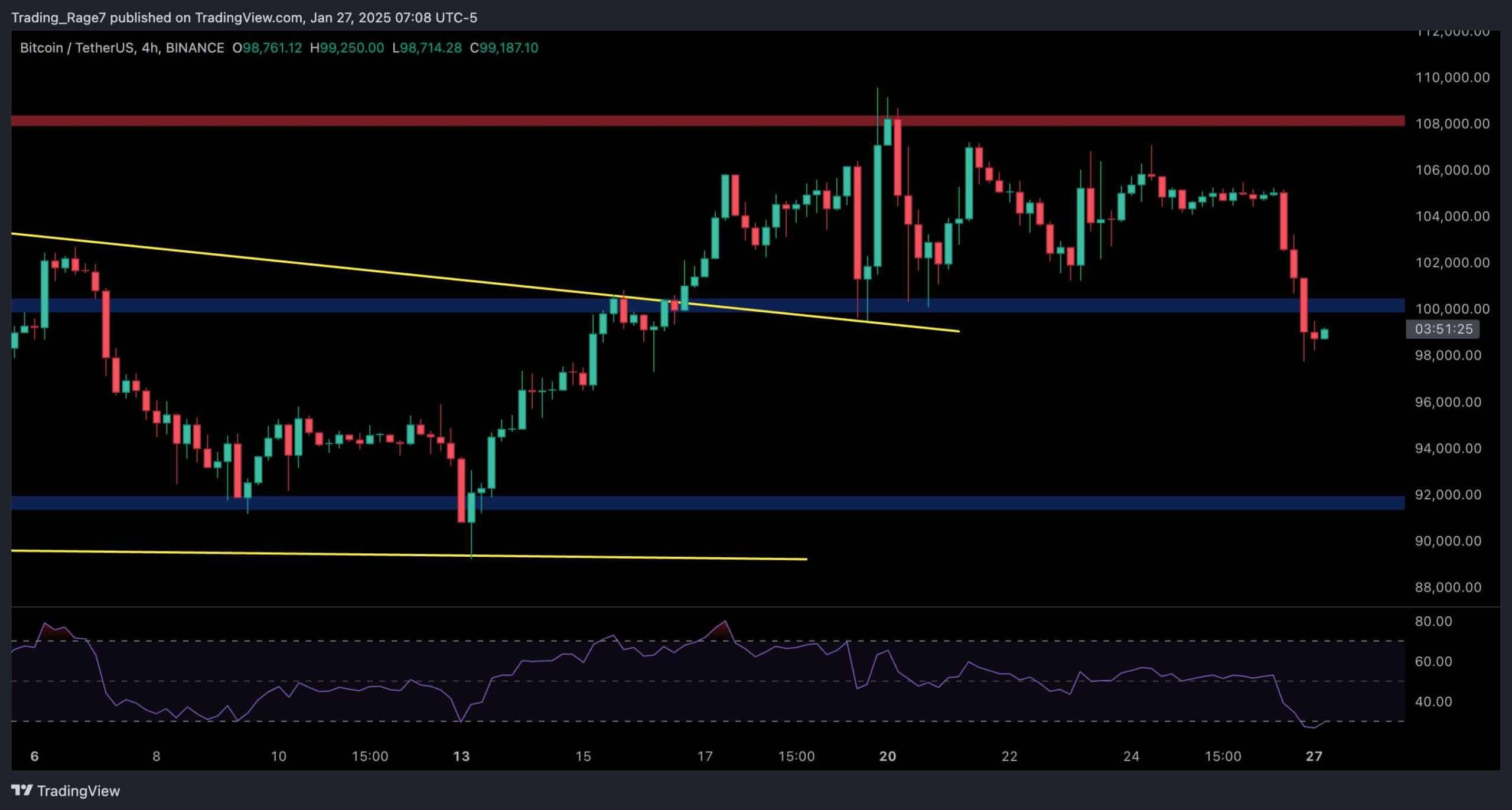 Actualmente, el precio est谩 rompiendo el nivel de $ 100k en el inconveniente, lo que podr铆a dar lugar a una ca铆da m谩s baja hacia el 谩rea de $ 92k en las pr贸ximas semanas. Dado que el RSI tambi茅n cae por debajo del 50%, el impulso en la tabla diaria es bajista y sugiere que una correcci贸n est谩 obligada a suceder a corto plazo.