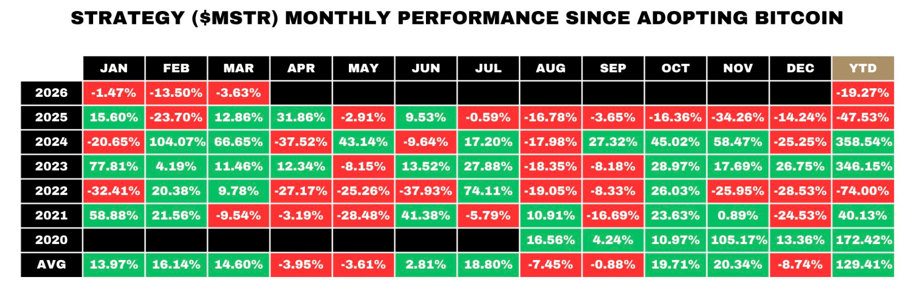 Los años anteriores pintaron un panorama dramáticamente diferente. MSTR obtuvo un rendimiento del 358,54% en 2024 y del 346,15% en 2023, períodos en los que Bitcoin se recuperó bruscamente.