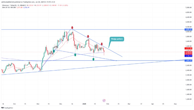 En las 煤ltimas seis semanas, el precio de Ethereum ha mostrado una correcci贸n notable de $ 4,100 a $ 3,200, registrando una ca铆da del 22%. La serie de altibajos consistentes indica una ca铆da sostenida y la formaci贸n de un patr贸n de cu帽a que cae.