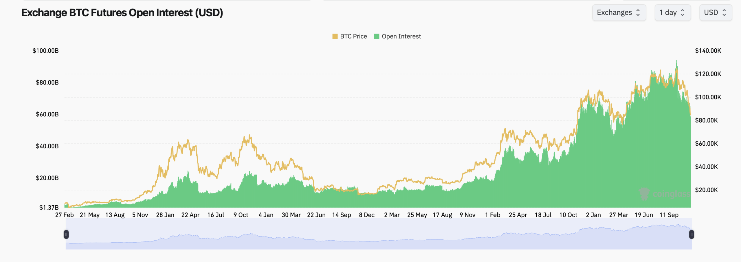 El mercado de futuros se está calentando, incluso cuando bitcoin merodea en una banda estrecha. Las estadísticas de Coinglass.com muestran que el interés abierto (OI) total de futuros se sitúa en 688.880 BTC, equivalente a 58.240 millones de dólares, lo que demuestra que los operadores no han abandonado el apalancamiento a pesar de la presión de la semana.