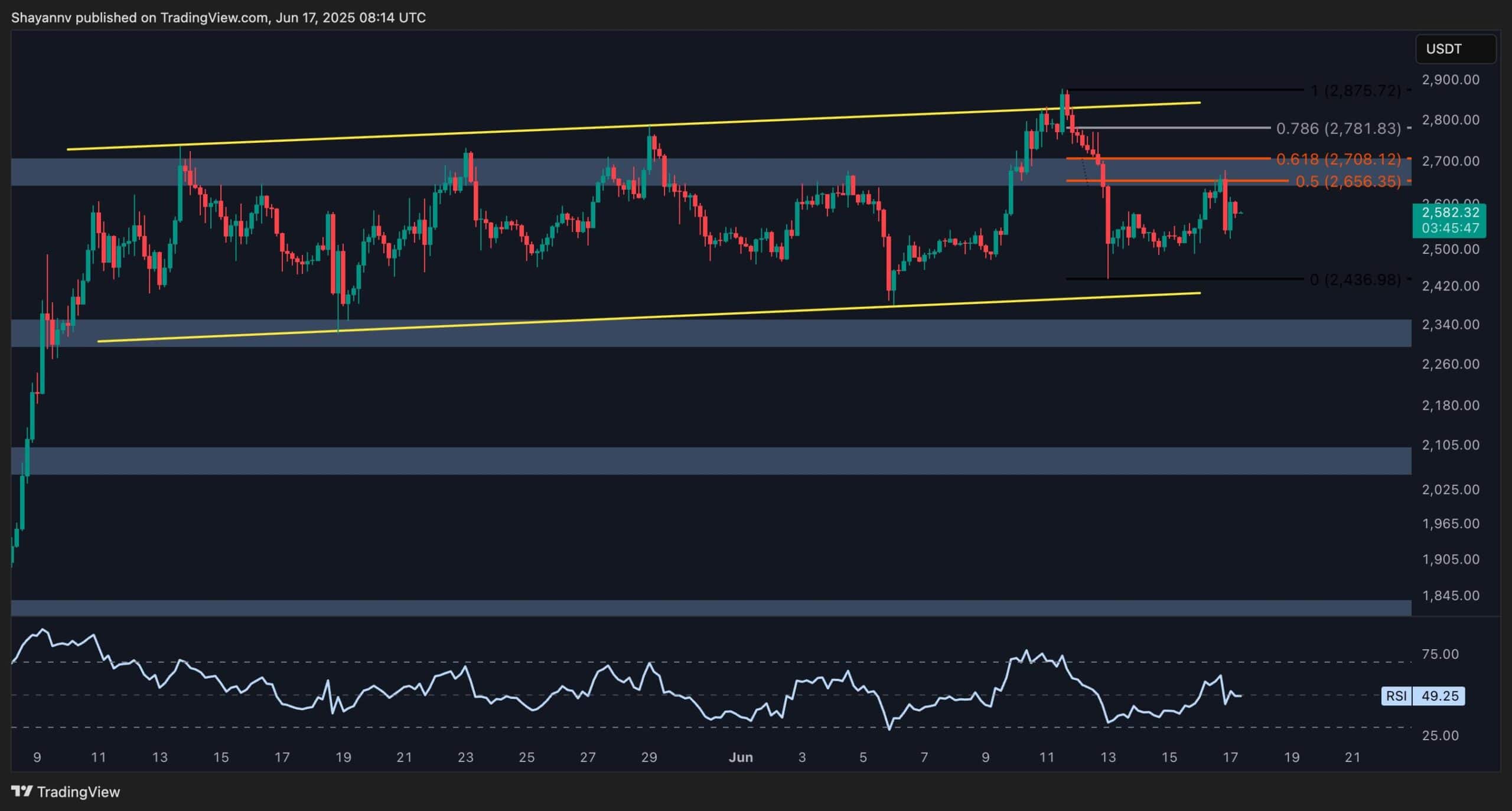 ETH permanece atascado en una fase de consolidación, cotizando justo debajo de la zona crítica de resistencia de $ 2.8K y el promedio móvil de 200 días. La acción del precio dentro de esta área ha carecido de una fuerza ascendente, con el mercado formando gradualmente un patrón de bandera ascendente. El rango está claramente definido por resistencia a $ 2.8k y soporte cerca de la zona de demanda de $ 2.4k.