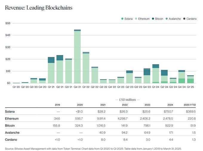 Solana generó $ 369.5 millones en ingresos durante el primer trimestre de 2025, ya que ya alcanzó el 50% de sus ingresos totales de 2024. Esto demuestra el crecimiento de ingresos más rápido de Solana, que excede los ingresos del primer trimestre de Ethereum de $ 220.8 millones. Según datos de rendimiento recientes, se espera que Solana supere los ingresos totales de Ethereum para el año.