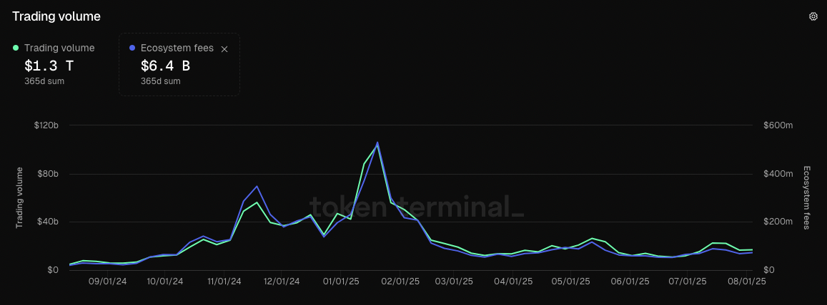 A pesar de la caída masiva de la actividad de Memecoin, las entradas a la cadena han mantenido su escena Defi en una fase de crecimiento. Pero la acumulación de tarifas de la cadena también ha disminuido sustancialmente en comparación con los máximos, cayendo de $ 530 millones en el máximo anterior, a $ 72.3 millones ahora, casi reflejando la tabla de actividades comerciales totales.