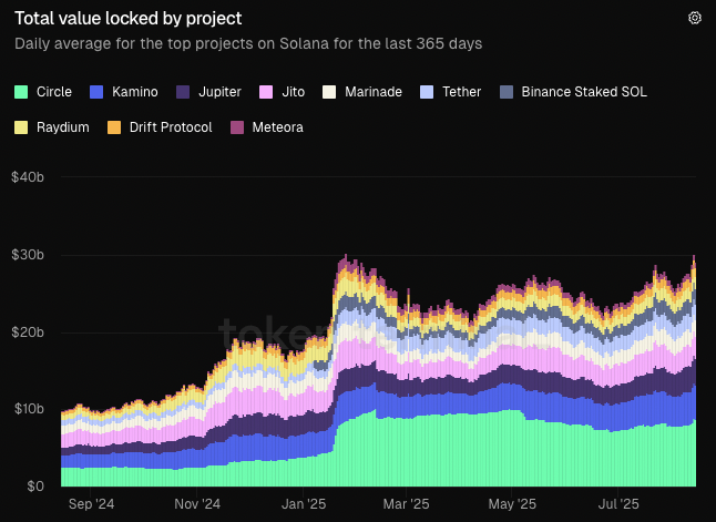 Circle, el emisor del USDC Stablecoin, es el conductor TVL más grande de Solana con $ 8.7 mil millones, lo que representa el 28% de la valoración del ecosistema de la cadena. Protocolo de préstamo Kamino, agregador de intercambio descentralizado Júpiter y Jito de protocolo de apuesta líquida, compensan otros $ 10.7 mil millones de TVL.