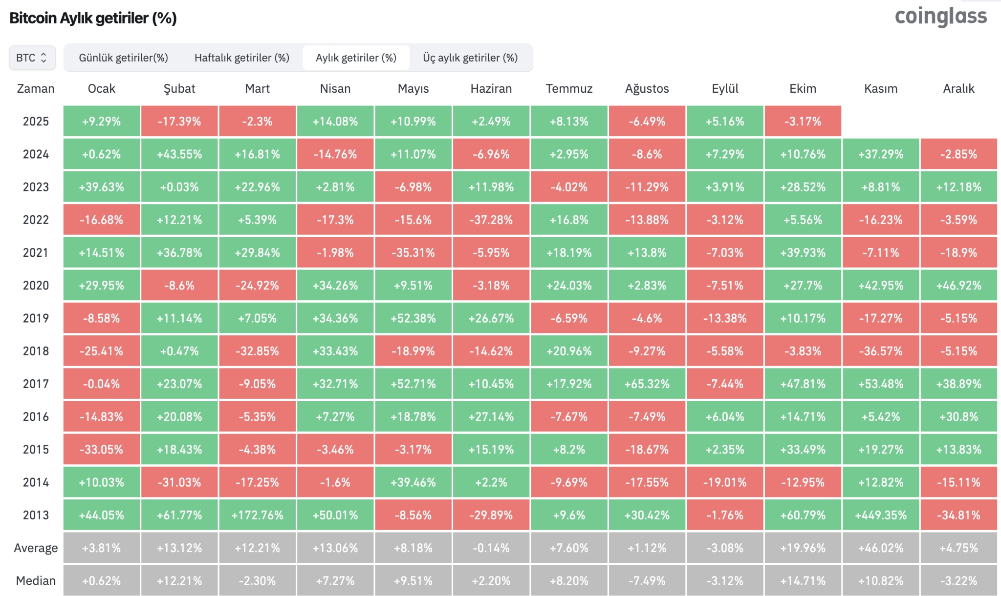 Según datos de Coinglass, noviembre es uno de los mejores meses históricos de Bitcoin, alcanzando una ganancia promedio del 46% en los 12 años transcurridos desde 2013. El período entre octubre y diciembre se destaca como el mejor trimestre en términos de aumentos de precios de BTC, con una ganancia promedio del 78%, según datos de CoinGlass.